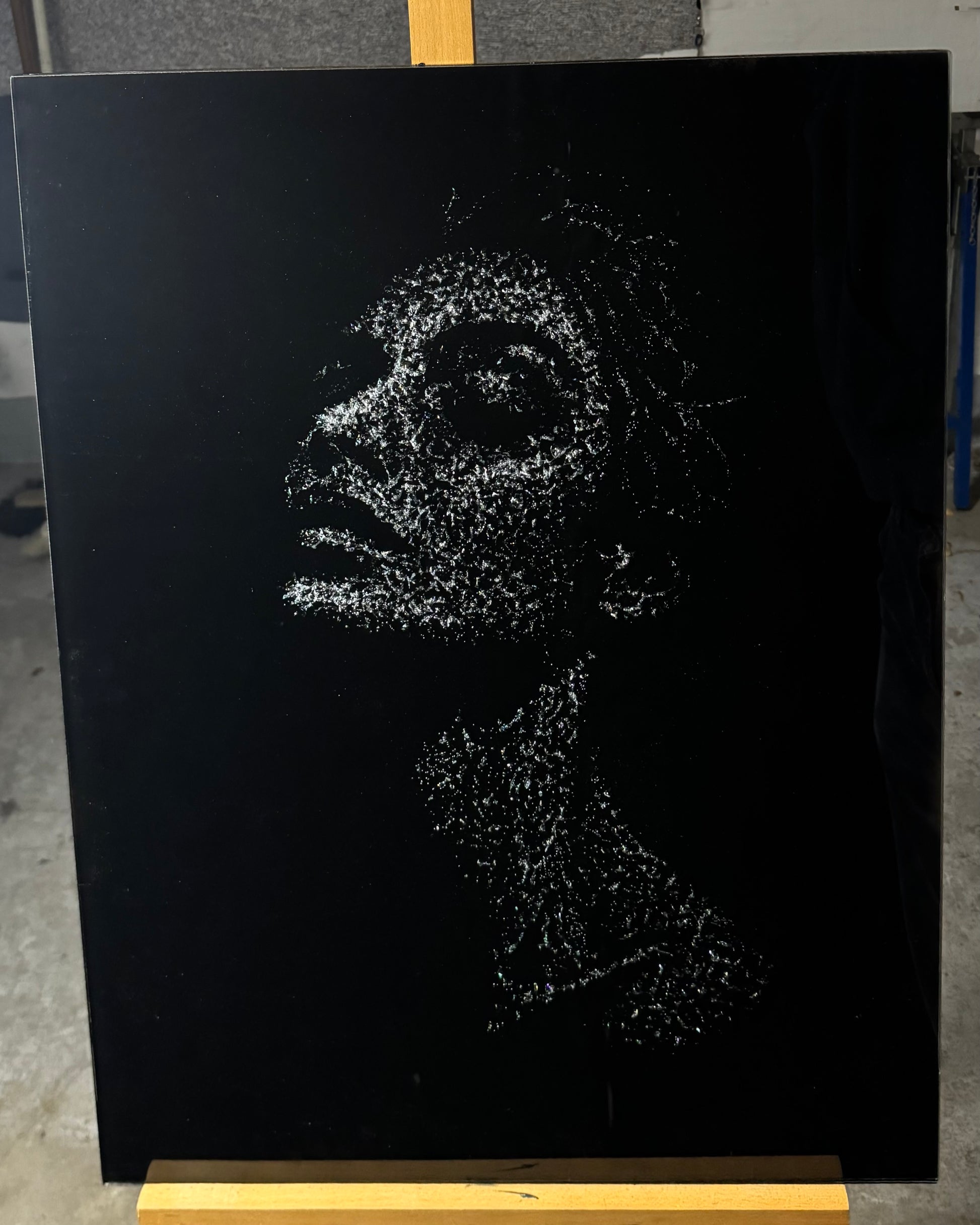 She simply glows – a soft, celestial light drawn only from fractured glass. The broken patterns wrap around her face and neck like a halo in motion, as if every shard remembers the impact that set it free.