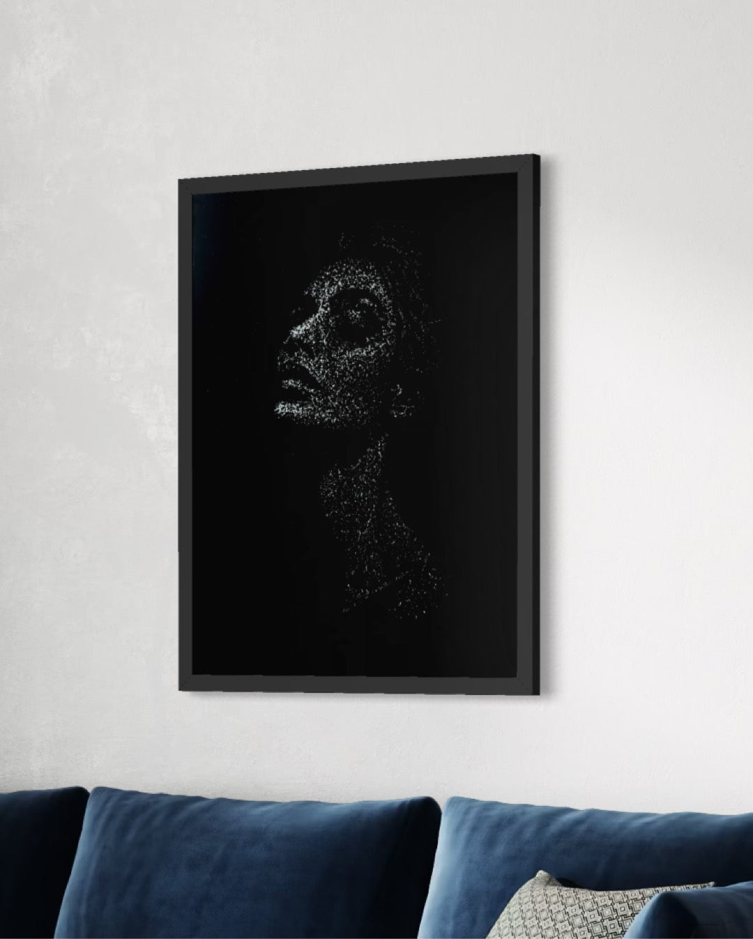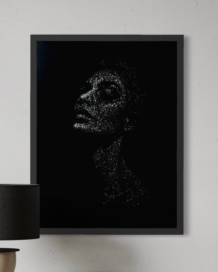 There is movement in the way her features dissolve into the darkness, as if she’s in the middle of becoming something more. You’re not just looking at a portrait – you’re catching a glimpse of a prayer caught between earth and sky.