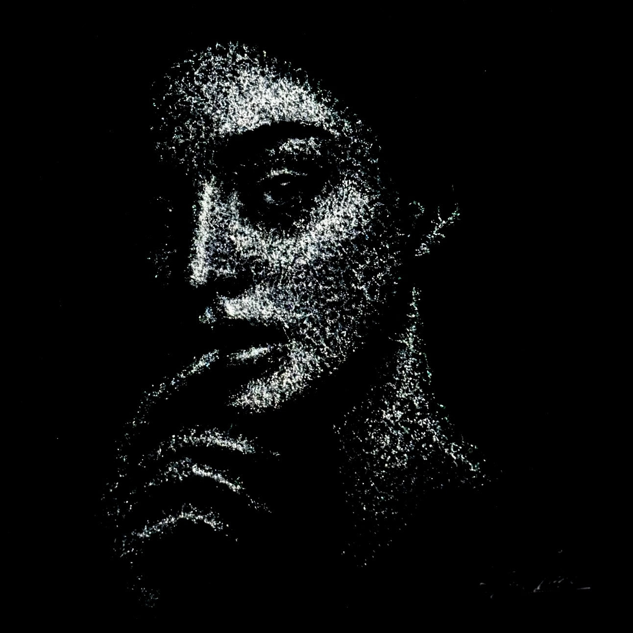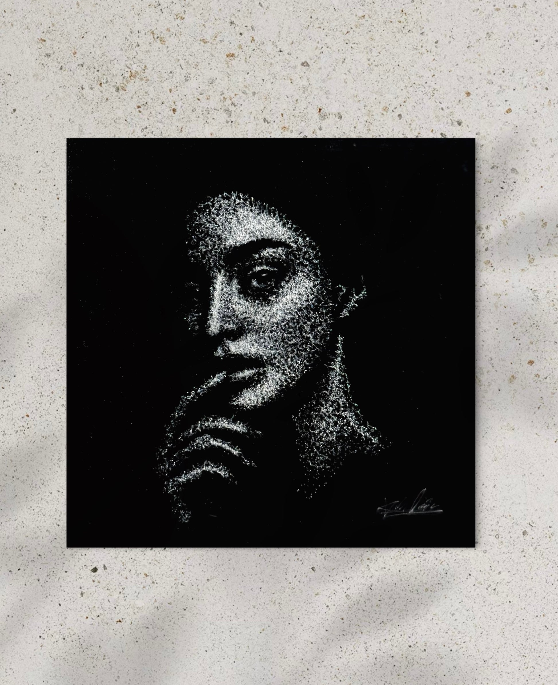 One hand lifted, barely touching the lips, thoughtful, sharp, observant.