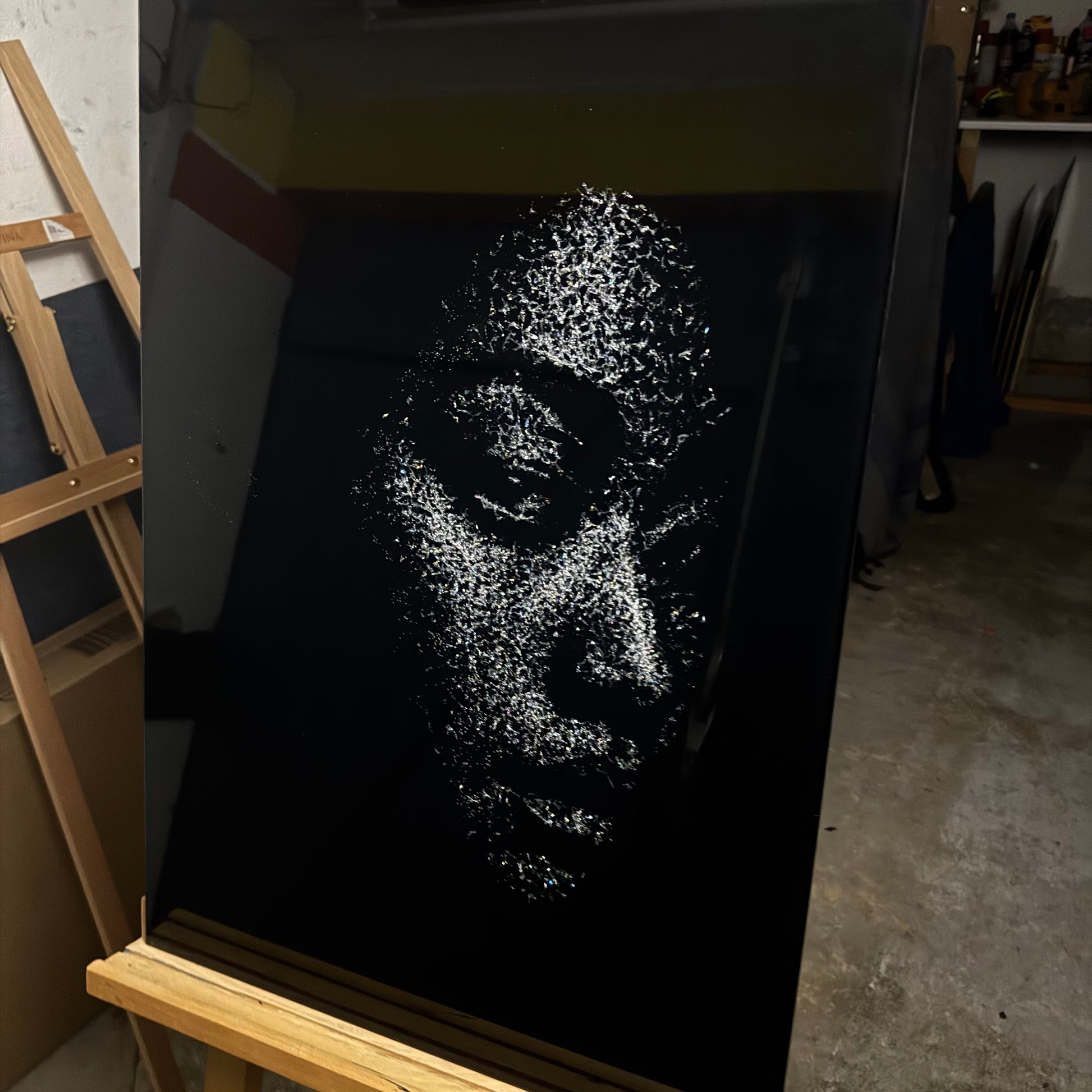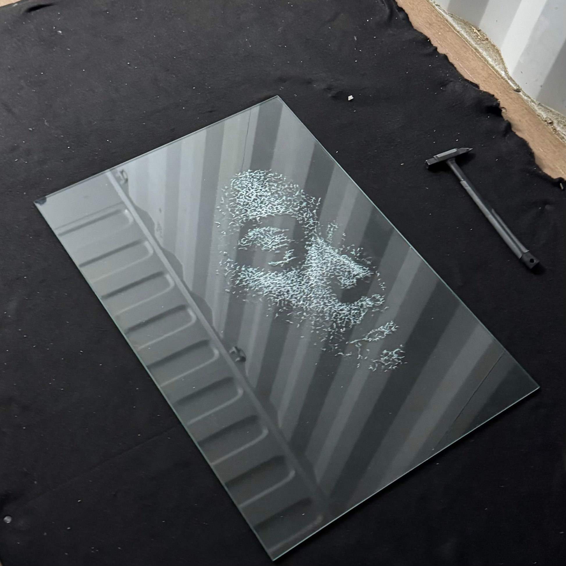 Every contour of her profile formed through shattered glass, each strike deliberate, each fracture catching the light in its own rhythm.