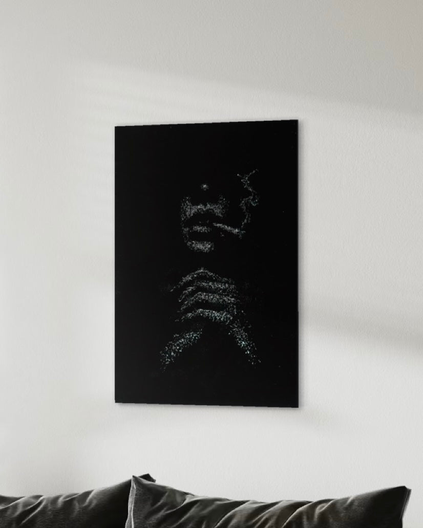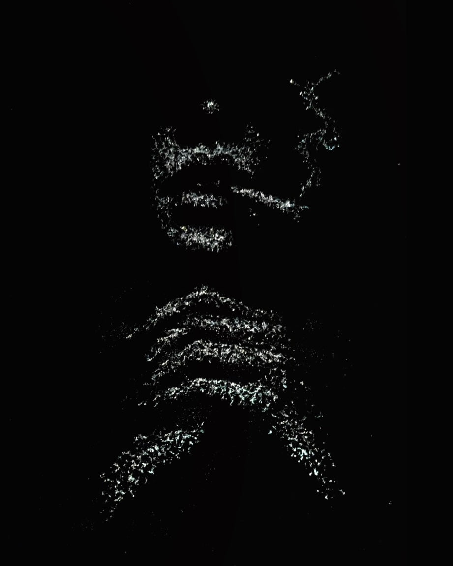 The light catches only what it needs to: the curve of her lips, the quiet tension in her knuckles, the thin line of smoke rising through the broken glass.